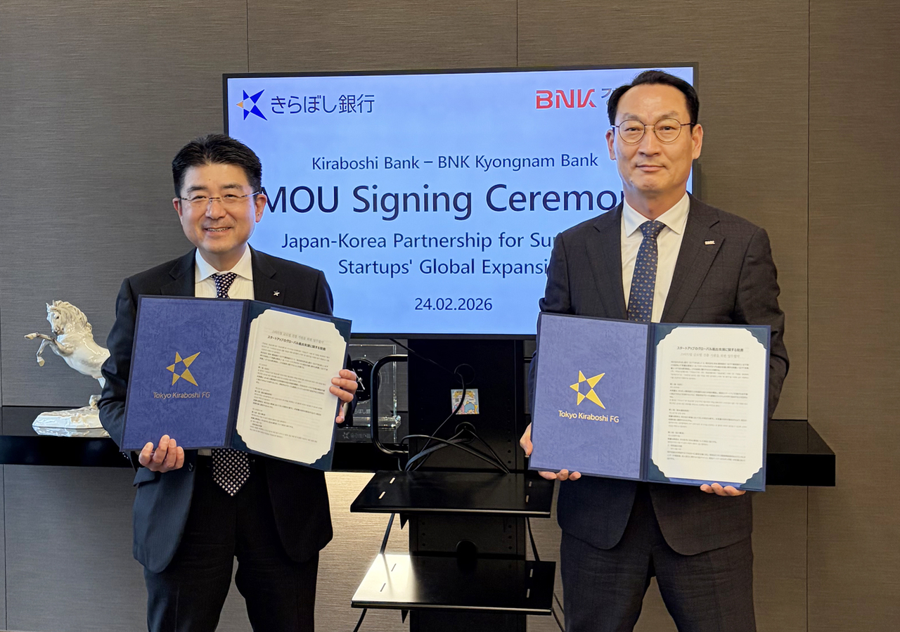 27일 BNK경남은행에 따르면 지난 24일 오후 일본 도쿄 키라보시은행 본점에서 ‘스타트업 글로벌 진출 지원을 위한 업무협약’을 체결했다. 이날 협약식에는 BNK경남은행 구태근 상무와 키라보시은행 콘도 켄타로 해외전략담당 이사가 참석해 협약서에 서명했다.