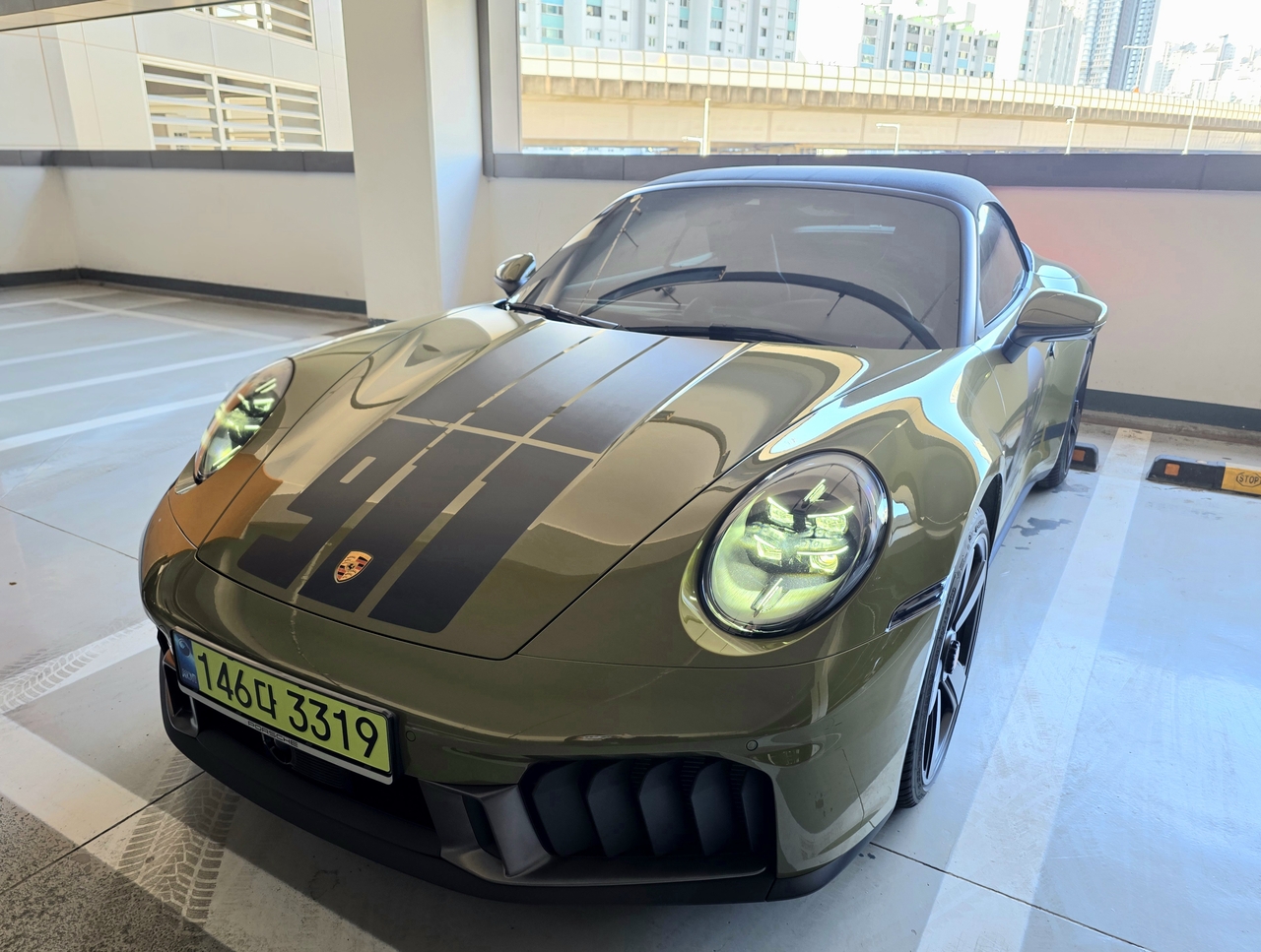 가장 먼저 눈길을 끄는 부분은 ‘올리브 네오’ 컬러다. 초록과 노랑의 경계에 선 독특한 색감이 클래식한 분위기를 강조한다. 보닛에는 실크 글로스 블랙 스트라이프 세 줄과 ‘911’ 레터링이 더해져 정체성을 분명히 드러낸다. 개구리 같은 인상을 만드는 둥근 헤드라이트와 낮게 깔린 차체 실루엣은 올리브 네오 컬러와 어우러져 경쾌하면서도 무게감을 잃지 않는다.