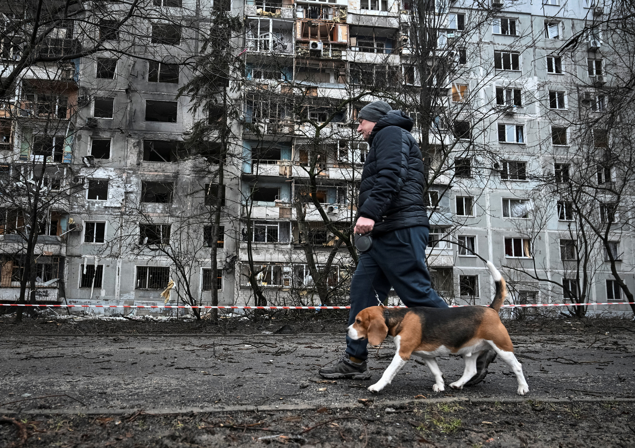 | 26일(현지시간) 우크라이나 자포리자에서 러시아 드론 공격을 받은 아파트 건물 인근을 한 남성이 개와 함께 걷고 있다. [로이터] |
