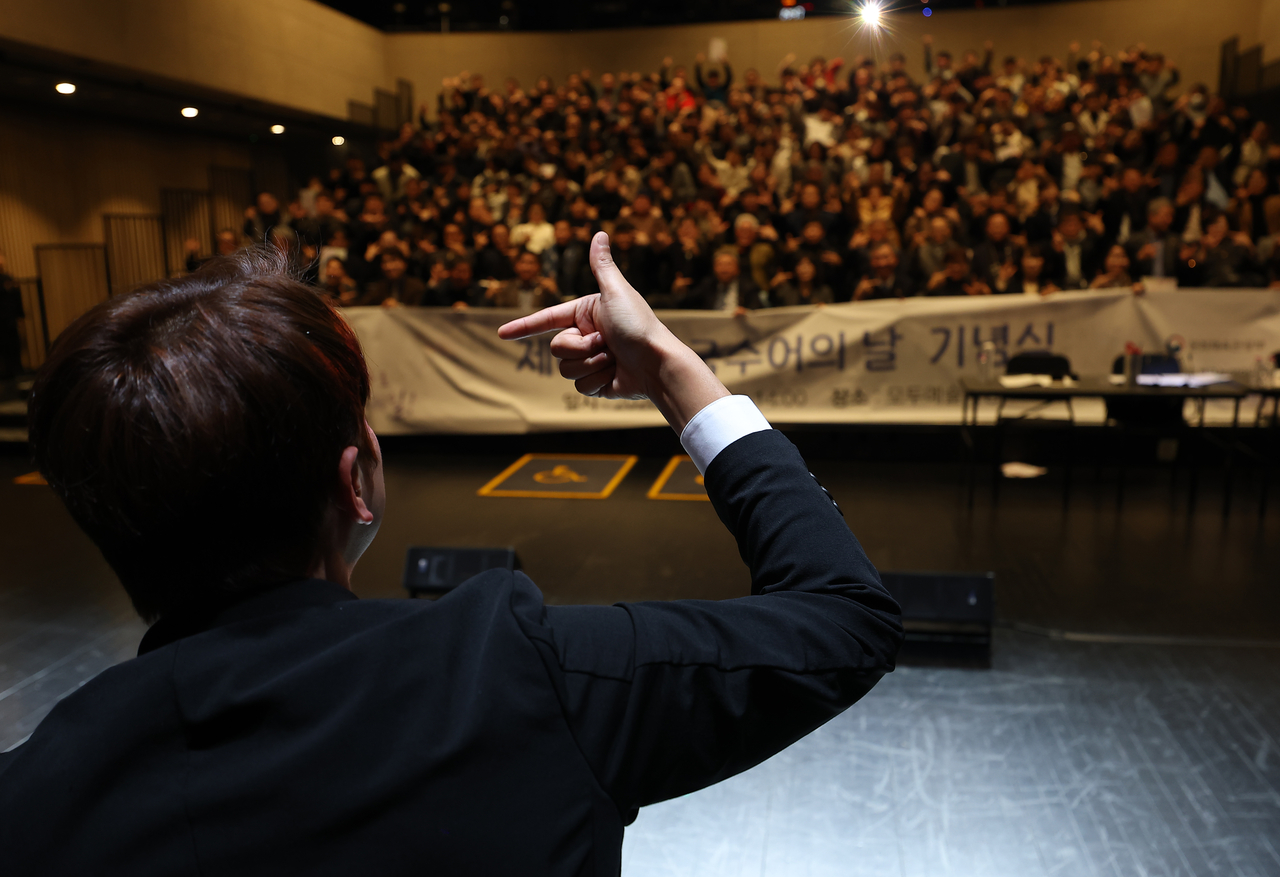 | 3일 서울 서대문구 모두예술극장에서 열린 제6회 한국수어의날 기념식에서 사회자가 수어로 6을 표현하고 있는 모습. 사진과 기사 내용은 무관. [연합] |