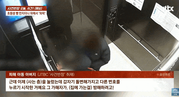 지난 26일 JTBC ‘사건반장’은 안양 아파트 성추행 사건의 피해 아동 부모로부터 받은 엘리베이터 CCTV 영상을 보도했다.