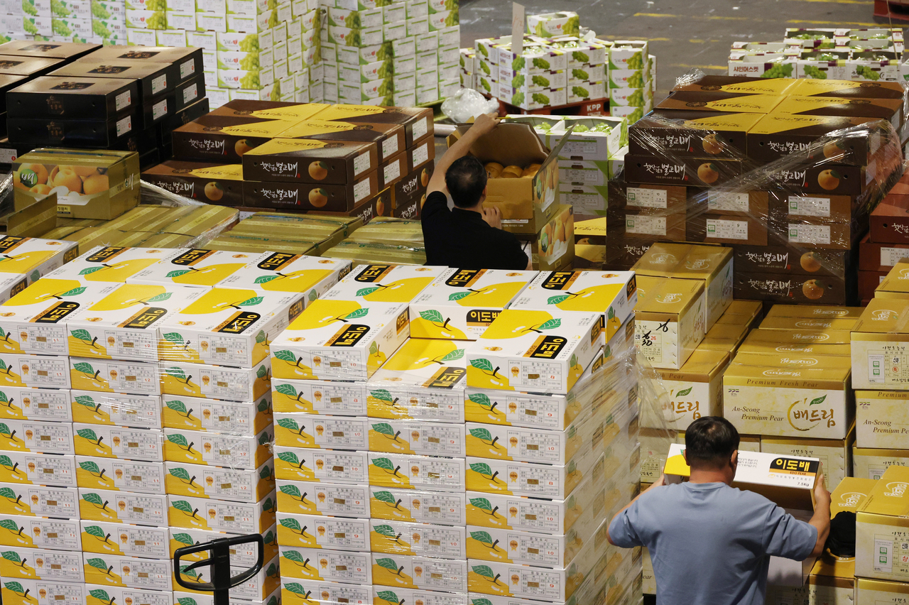 | 지난해 9월 22일 서울 송파구 가락동 농수산물도매시장에서 다가오는 추석을 앞두고 상인들이 과일상자를 분주하게 움직이고 있다. [연합] |