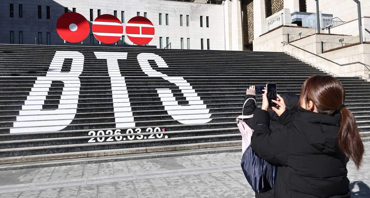 | 지난 1월 22일 서울 종로구 세종문화회관 계단에서 일본인 관광객들이 오는 3월 3년 9개월 만에 ‘완전체’로 돌아오는 그룹 방탄소년단(BTS)의 컴백을 알리는 홍보물을 기념촬영하고 있다. [연합] |