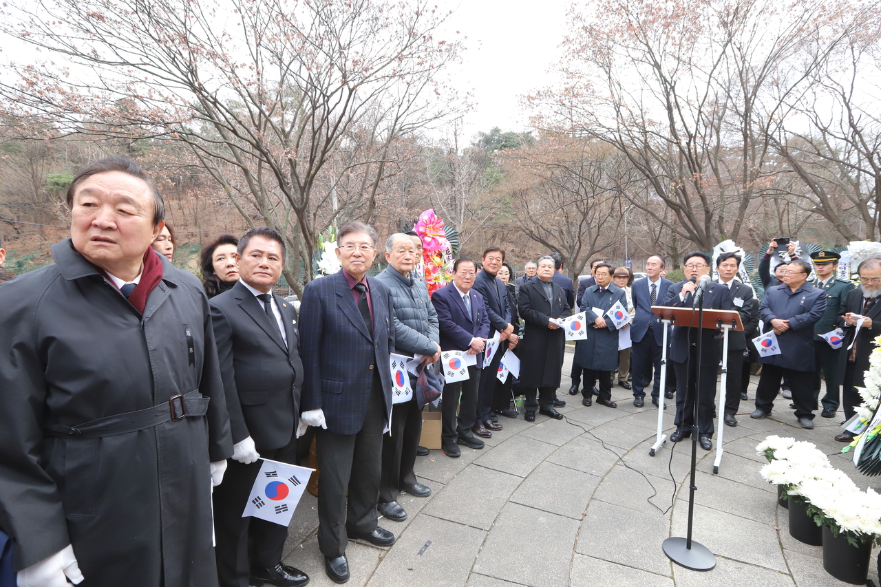 | 서울 장충단 공원에서 107주년 3.1절 기념 유관순 열사 추념식이 진행된 가운데 유준상 더좋은나라전략포럼 대표가 인사말을 하고 있다. |