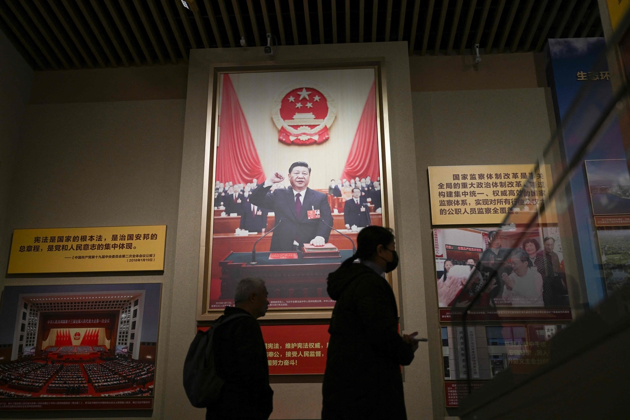 | 지난 1일 중국 베이징의 중국 공산당 박물관에서 전국인민대표대회(NPC) 연례 회의 개막을 앞두고 방문객들이 시진핑 중국 국가주석의 초상화 앞을 지나가고 있다. [AFP] |