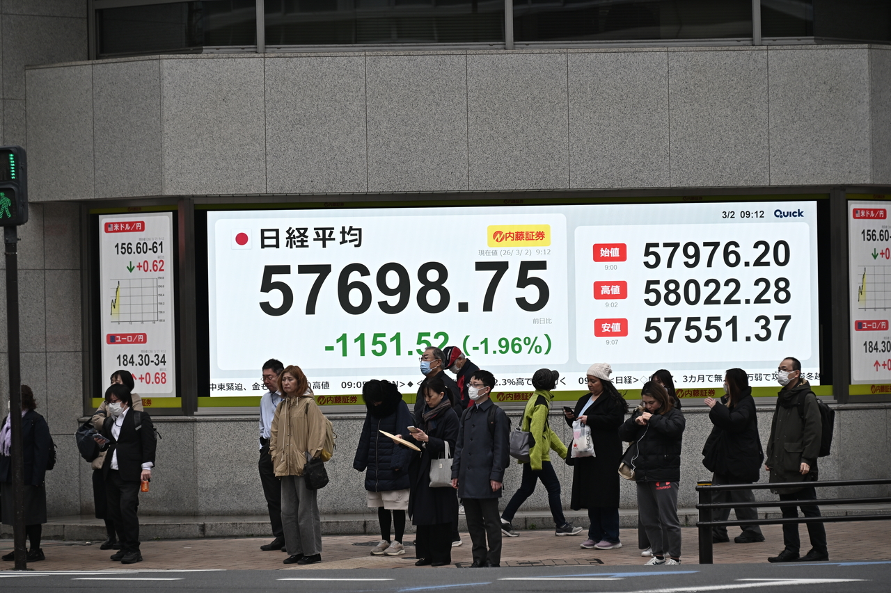 일본 증시 대표 주가지수인 닛케이225 평균주가(닛케이지수)는 이날 오전 9시 30분께 이전 거래일 대비 1500포인트 이상 하락한 5만7285를 기록했다. 최대 하락률은 약 2.7%였다. 다만 이후 상승세로 돌아서 오전 장을 1.53% 내린 5만7950으로 마감했다. 니혼게이자이신문(닛케이)은 “미국과 이스라엘의 이란 공격과 이에 따른 원유 가격 급등으로 투자자들의 위험 회피가 강해졌다”고 분석했다.