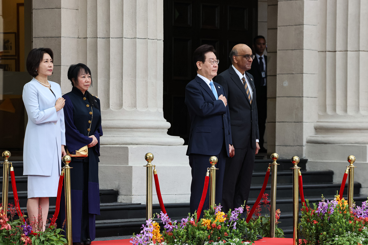 | 이재명 대통령과 김혜경 여사가 2일 싱가포르 외교부 청사에서 열린 국빈방문 환영식에서 국기에 경례하고 있다. 이 대통령 오른쪽은 타르만 샨무가라트남 싱가포르 대통령. [연합] |