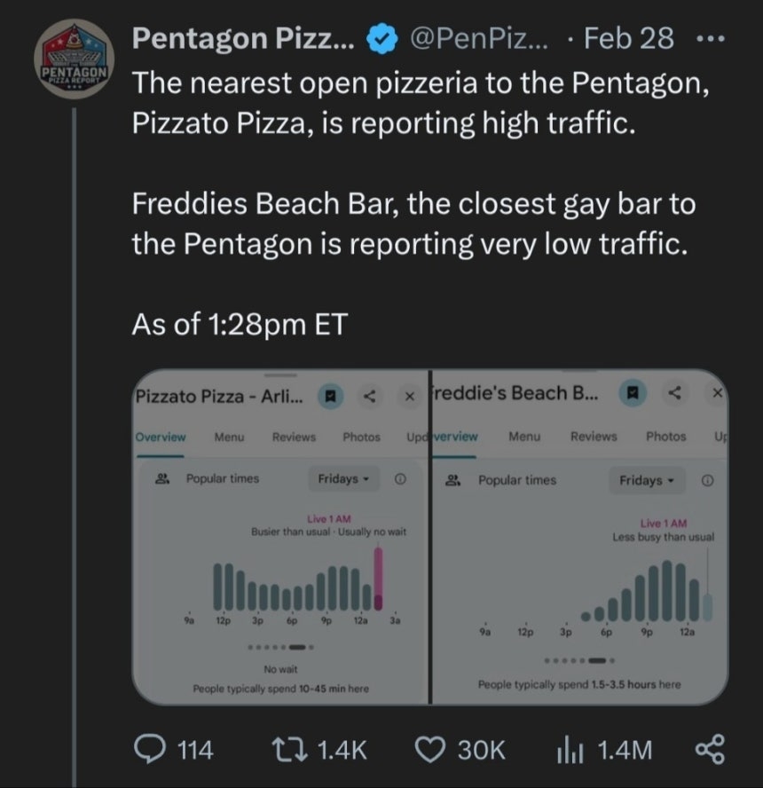2024년 8월에 활성화된 이 계정은 구글 지도의 ‘인기 시간대’ 기능을 활용해 국방부 주변 피자 가게가 평소보다 바쁜지 추적한다.