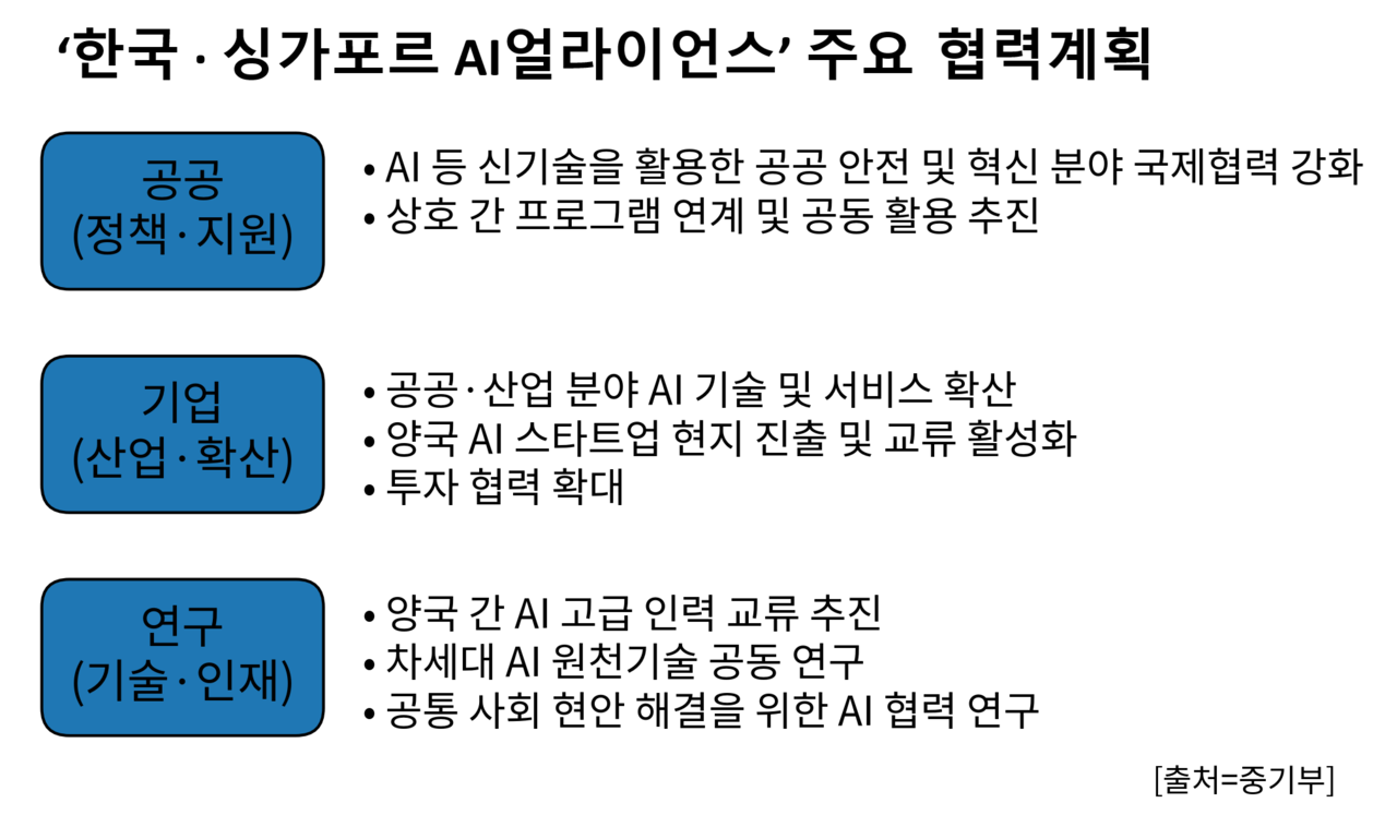 한국은 올해 2월 ‘AI 행동계획’을 발표했고, 싱가포르는 2024년부터 2029년까지 ‘국가 AI전략 2.0’을 추진 중이다. 양국은 미국, 중국에 이어 세계적 수준의 AI 경쟁력을 확보하기 위해 연구개발(R&D), 투자 생태계, 인재 양성 등에서 총력전을 펼치고 있다는 공통점을 갖고 있다. 정부는 싱가포르와의 전략적 협력을 통해 국가 AI 역량을 끌어올리고, 글로벌 AI 3강 도약에 속도를 낸다는 구상이다.