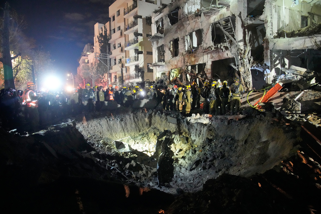 | 지난 1일 이란 미사일이 이스라엘 텔아비브를 강타한 다음 날, 구조대원과 군인들이 현장을 살피고 있다[AP] |