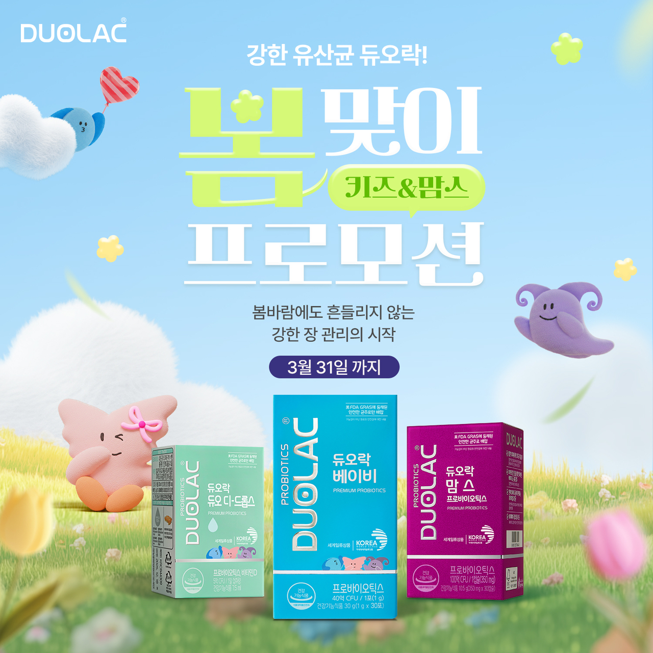 [헤럴드경제=최은지 기자] 쎌바이오텍의 유산균 브랜드 ‘듀오락(DUOLAC)’이 환절기 면역력 강화를 위한 ‘봄맞이 키즈&맘스 프로모션’을 3월 31일까지 진행한다고 3일 밝혔다.