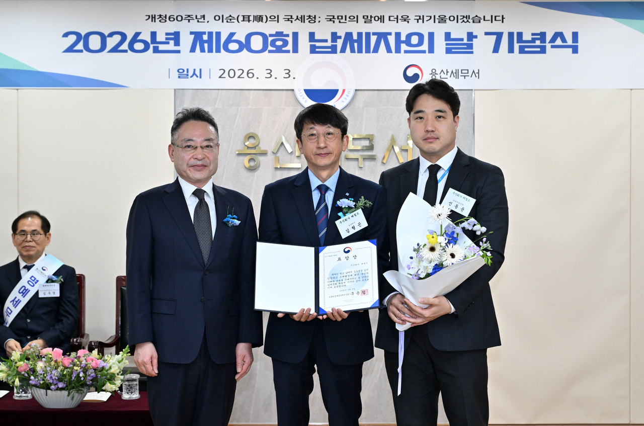 헤럴드 ‘납세자의 날’ 표창장·재정경제부 장관상 수상 글꼴 선택 본문 텍스트 크게본문 텍스트 작게 인쇄 3일 오전 서울 용산구 용산세무서에서 열린 제60회 납세자의 날 기념식에서 주식회사 헤럴드가 세정협조자 표창장과 부총리 겸 재정경제부 장관상을 수상했다. 김상원(왼쪽부터) 용산세무서장, 김형곤 헤럴드경제 총괄전무, 신동윤 경영지원실장이 기념촬영을 하고 있다. 임세준 기자