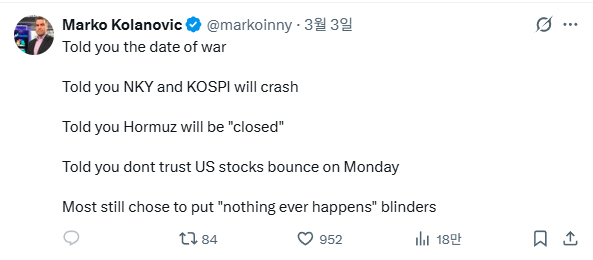 마르코 콜라노비치 전 JP모건 수석 전략가는 3일(현지시간) 엑스(X)를 통해 “나는 전쟁이 벌어질 날짜와 닛케이·코스피가 폭락할 것이라고 이미 말했다. 호르무즈 해협이 봉쇄될 것이고, 지난 월요일(2일)에 미국 증시의 움직임을 믿지 말라고도 미리 말했다”면서 “그런데 대부분은 여전히 ‘아무 일도 일어나지 않을 것’이라며 눈을 가리고 있다”고 주장했다.