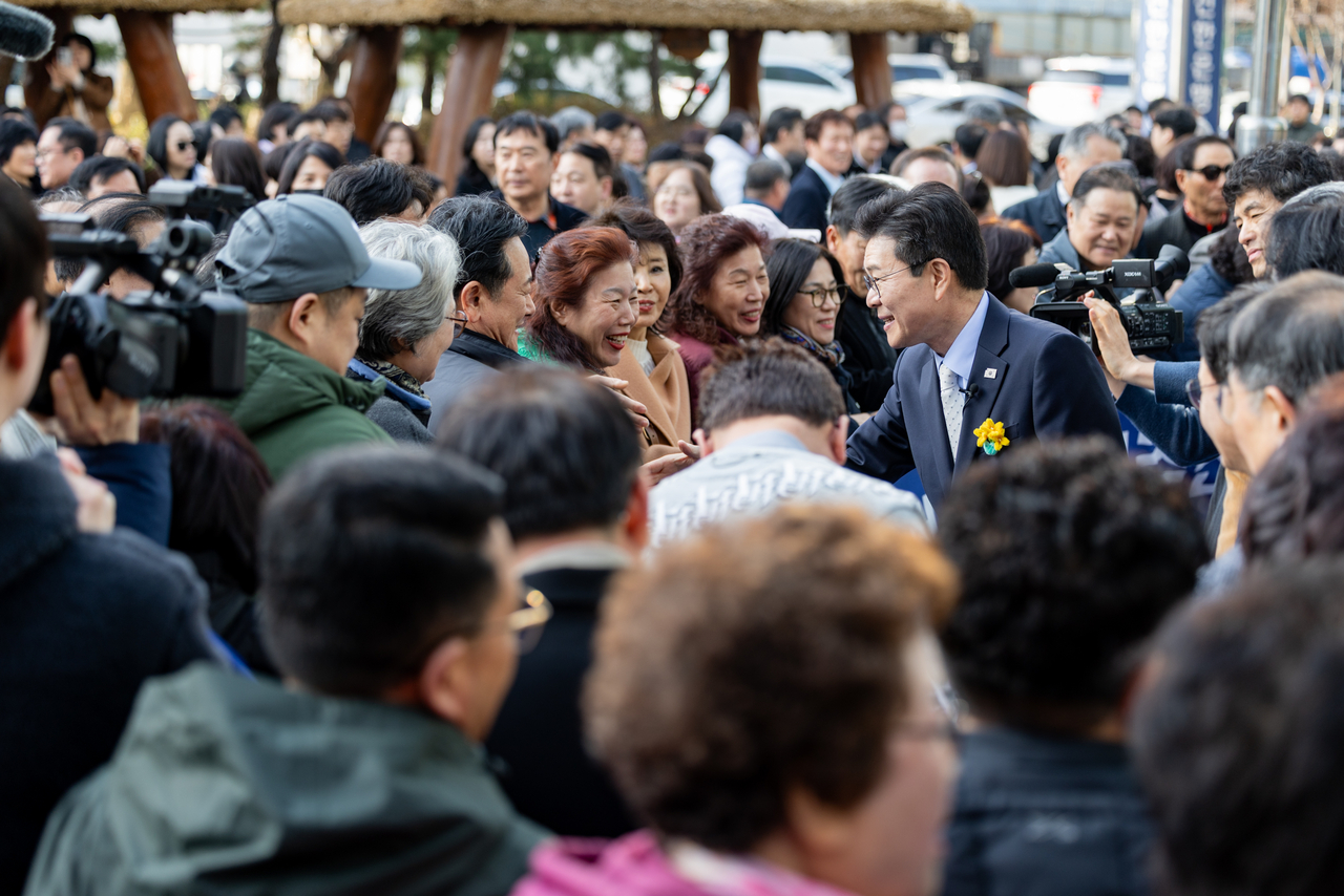 | 성동구청 직원 및 구민들과 작별 인사 나누는 정원오 성동구청장 |