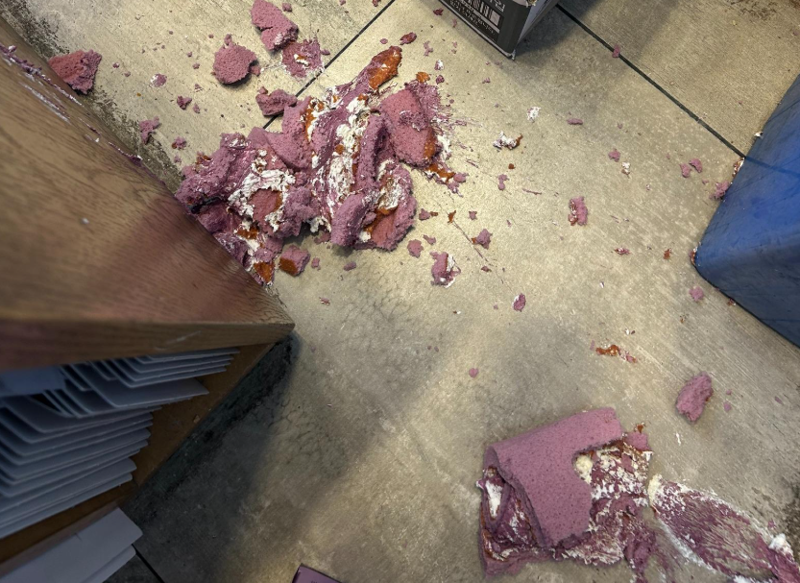 A씨는 당시 상황이 담긴 사진을 공개했는데 매장 바닥에 분홍색 롤케이크가 부서져 흩어져 있고 제품 상자는 한쪽에 떨어져 있는 모습이 담겼다.
