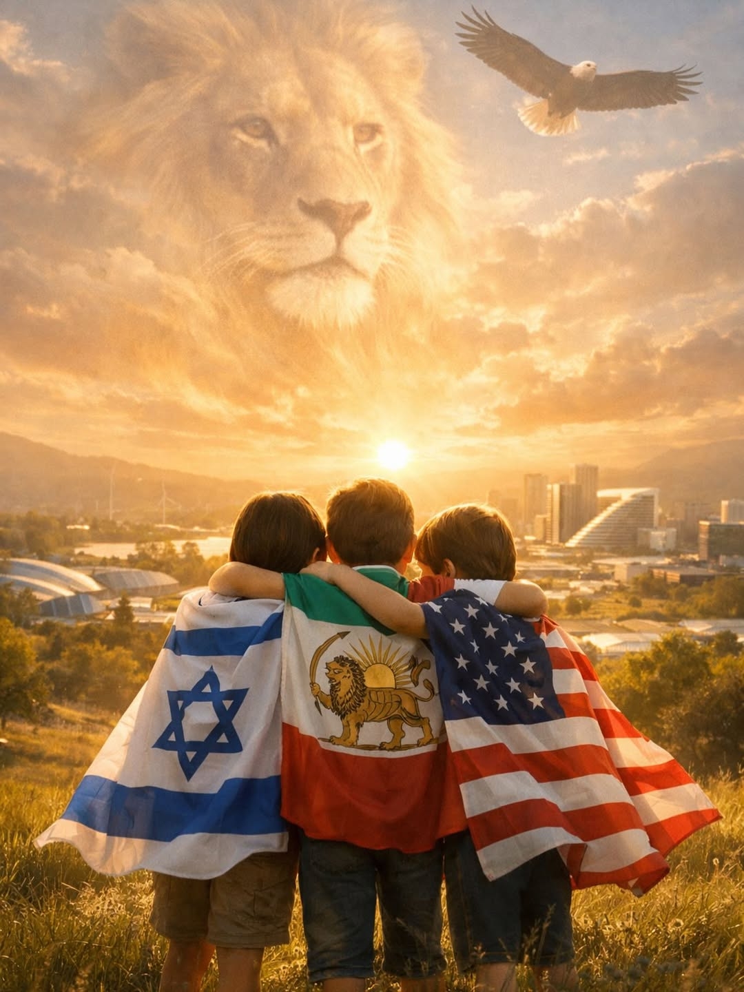 인공지능(AI)를 이용해 만든 것으로 추정되는 이 사진엔 이란 국기를 두른 어린이를 가운데 두고 이스라엘과 미국 국기를 두른 어린이들이 좌우에서 어깨동무를 하며 태양을 바라보고 있다.