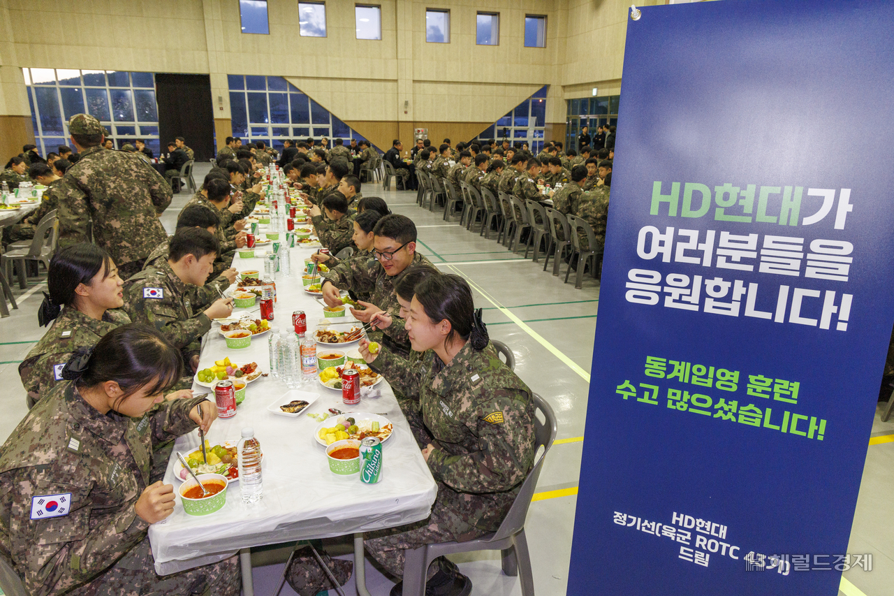 | 2025년 1월 진해 해군교육사령부에서 동계 훈련 중인 해군 학군사관후보생(ROTC)들이 HD현대가 보낸 바비큐 특식을 식사하는 모습. [HD현대 제공] |