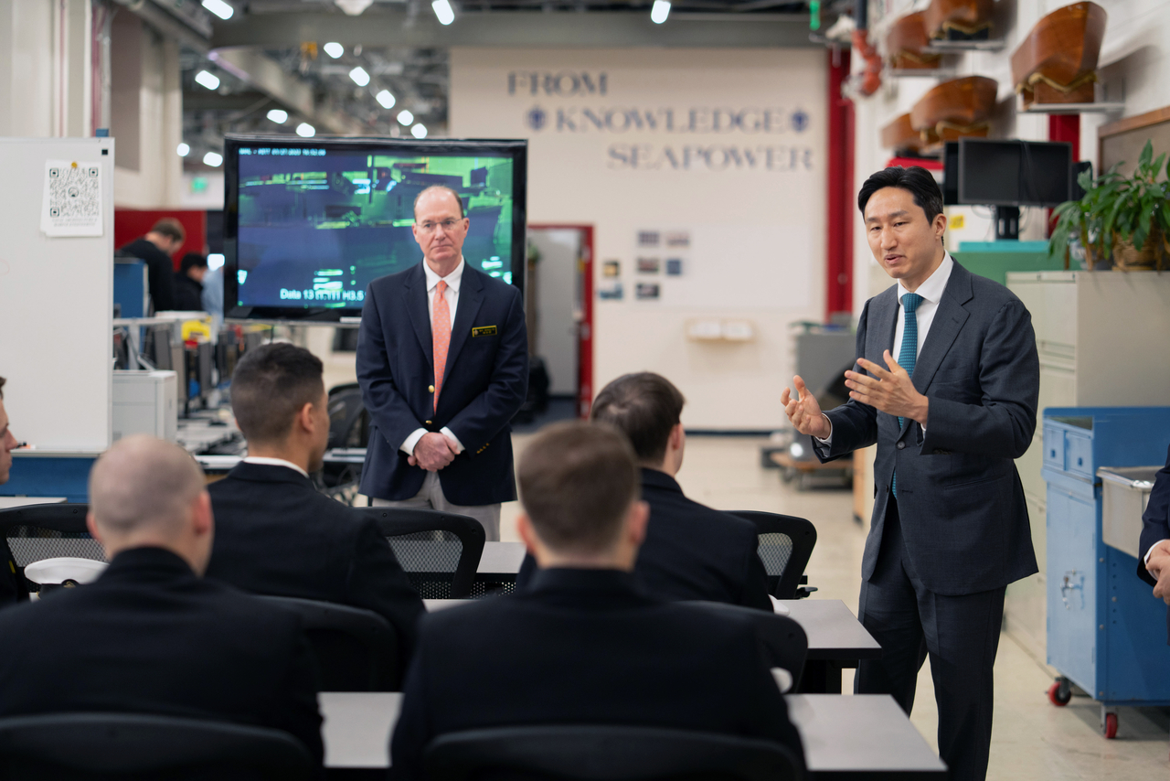 | 정기선 HD현대 회장이 2025년 3월 미국 메릴랜드주 아나폴리스에 위치한 미 해군사관학교를 방문한 당시의 모습. [HD현대 제공] |