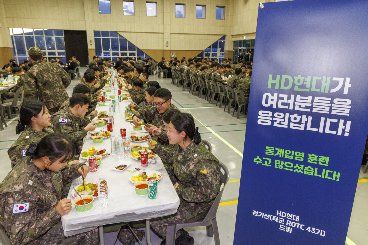 | 2025년 1월 진해 해군교육사령부에서 동계 훈련 중인 해군 학군사관후보생(ROTC)들이 HD현대가 보낸 바비큐 특식을 식사하는 모습. [HD현대 제공] |