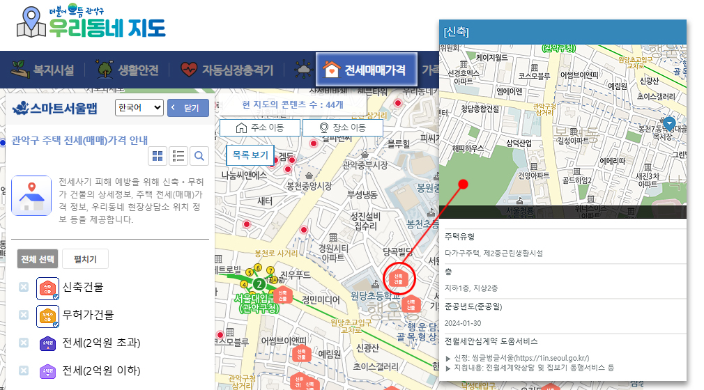 구는 관악구청 누리집 ‘우리동네지도’ 내 ‘전세매매가격’탭에서 주거 정보를 제공하고 있다. 지도에는 ▲신축무허가 건물 정보 ▲주택 전세·매매 가격정보 ▲우리동네 현장상담소 위치 정보 등 데이터를 아이콘으로 구분해 시각화했다.