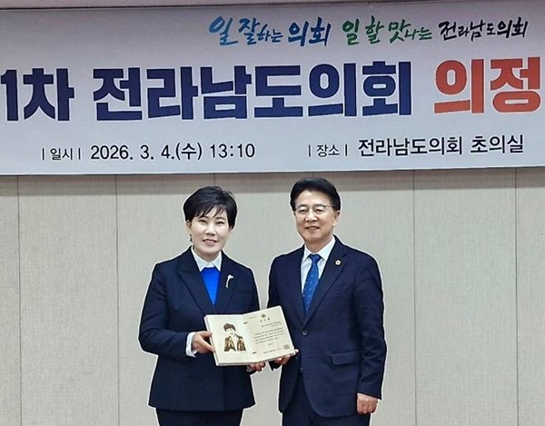 [헤럴드경제(순천)=박대성 기자] 김태균 전라남도의회 의장이 의정발전에 기여한 공로로 김미영 의정자문위원장(순천)에게 감사패를 전달했다.