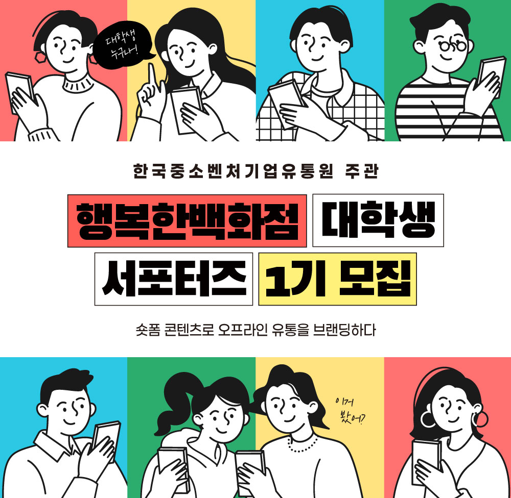 [헤럴드경제=홍석희 기자] 한국중소벤처기업유통원은 서울 목동에 위치한 중소기업 전용 ‘행복한백화점’에서 소비자 접점 확대를 위한 대학생 서포터즈를 모집한다고 6일 밝혔다.