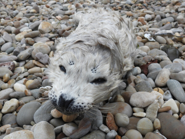 | 백령도 북쪽 해안에서 발견된 태어난 지 1개월 내외로 보이는 새끼 점박이물범의 모습. [인천녹색연합 제공] |