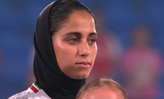 | 2일(현지시간) 호주 골드코스트 스타디움에서 열린 2026 아시아축구연맹(AFC) 여자 아시안컵 조별리그 A조 1차전에서 대한민국과 맞붙은 이란 대표팀 선수가 경기 시작 전 국가가 연주되자 따라부르지 않고 침묵을 지키고 있다. [SNS] |