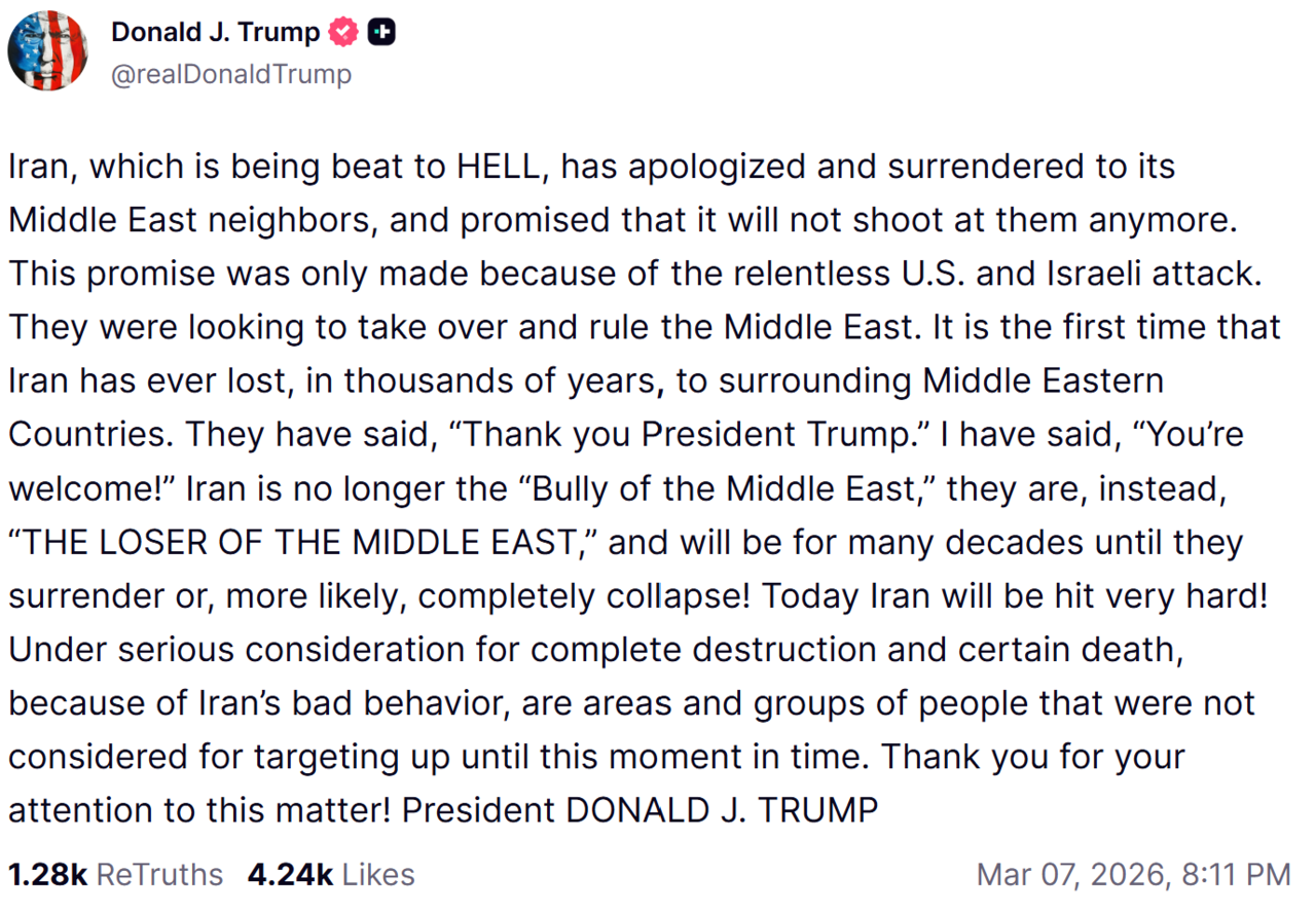 | 도널드 트럼프 미국 대통령이 7일(현지시간) 이란이 더 큰 공격을 받을 것이라고 말했다. 트루스소셜 갈무리. |