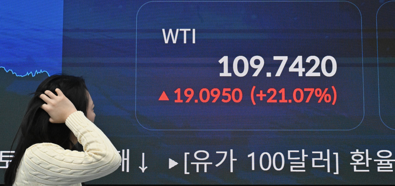 | 9일 오전 서울 중구 우리은행 딜링룸 전광판에 서부텍사스산원유(WTI) 가격이 표시되어 있다. 임세준 기자 |