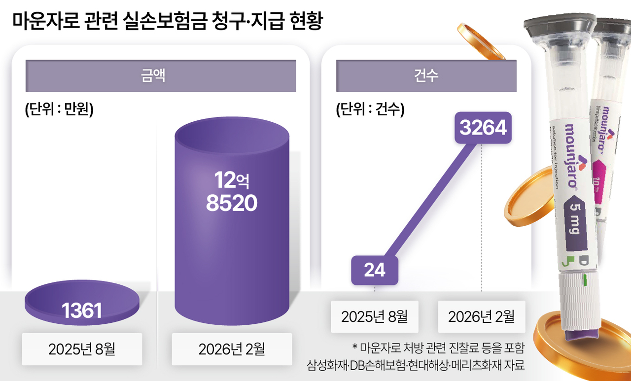 [헤럴드경제=박성준 기자] 비만치료 주사제 마운자로의 실손의료보험금 청구가 출시 반년 만에 136배 급증한 것으로 나타났다. 마운자로는 같은 비만치료제인 위고비와 달리 당뇨병 치료제로도 허가돼 있어, 비만 목적 처방을 당뇨 치료로 포장해 실손보험금을 타 내는 우회 청구가 가능한 구조다. 관련 오남용 사례가 잇따르면서 보험업계와 금융당국이 예의주시하고 있다.