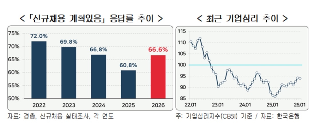 [헤럴드경제=서재근 기자] 한국경영자총협회(경총)는 100인 이상 기업 500개사를 대상으로 ‘2026년 신규채용 실태조사’를 실시한 결과, 응답 기업의 66.6%가 ‘올해 신규채용 계획이 있다’고 답했다고 10일 밝혔다.