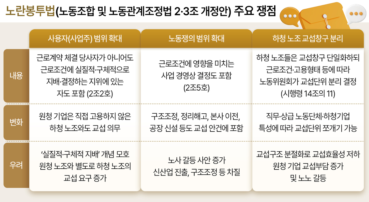 노란봉투법은 사용자 범위와 노동쟁의 대상을 확대하고 파업 노동자에 대한 기업의 손해배상 청구를 제한하는 내용을 골자로 한다. 특히 하청 노동자가 실질적 영향력을 가진 원청과 교섭할 수 있도록 하면서 산업 현장의 교섭 구조를 크게 바꿀 것으로 평가된다. 쟁의 대상 역시 실질적 근로조건 변화를 초래할 경우 해외 투자나 공장 증설 등 경영 의사 결정까지 확대될 수 있다는 해석이 나오고 있다.