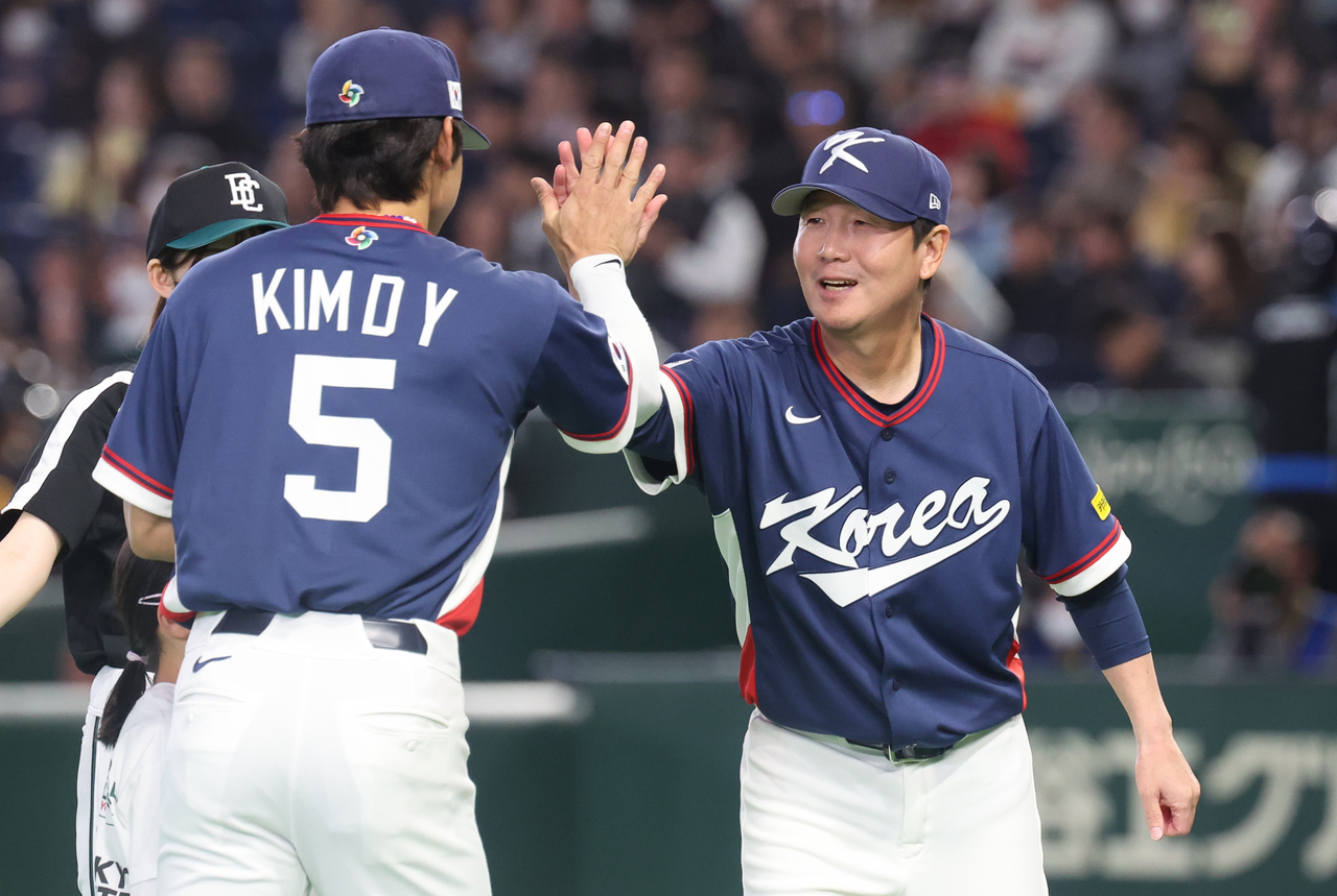 | 9일 일본 도쿄돔에서 열린 2026 월드베이스볼클래식(WBC) C조 조별리그 최종전 대한민국과 호주의 경기에 앞서 한국 류지현 감독이 김도영과 하이파이브하고 있다. [연합] |