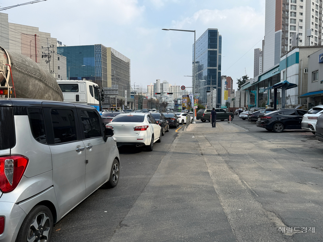 | 9일 오후 2시께 서울 구로구의 한 주유소 앞에 대기 중인 차량. 이날 해당 주유소는 입구부터 약 150m가량 대기 줄이 형성됐다. 전새날 기자 |