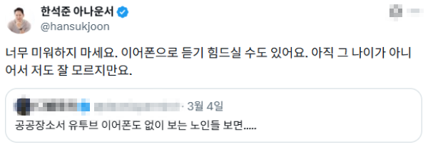 최근 한석준은 자신의 엑스(X·옛 트위터)에 한 누리꾼의 글을 인용하며 의견을 밝혔다. 앞서 한 이용자는 “공공장소에서 유튜브를 이어폰 없이 보는 노인들을 보면…”이라는 글을 올렸고 해당 게시물은 온라인에서 빠르게 확산됐다.