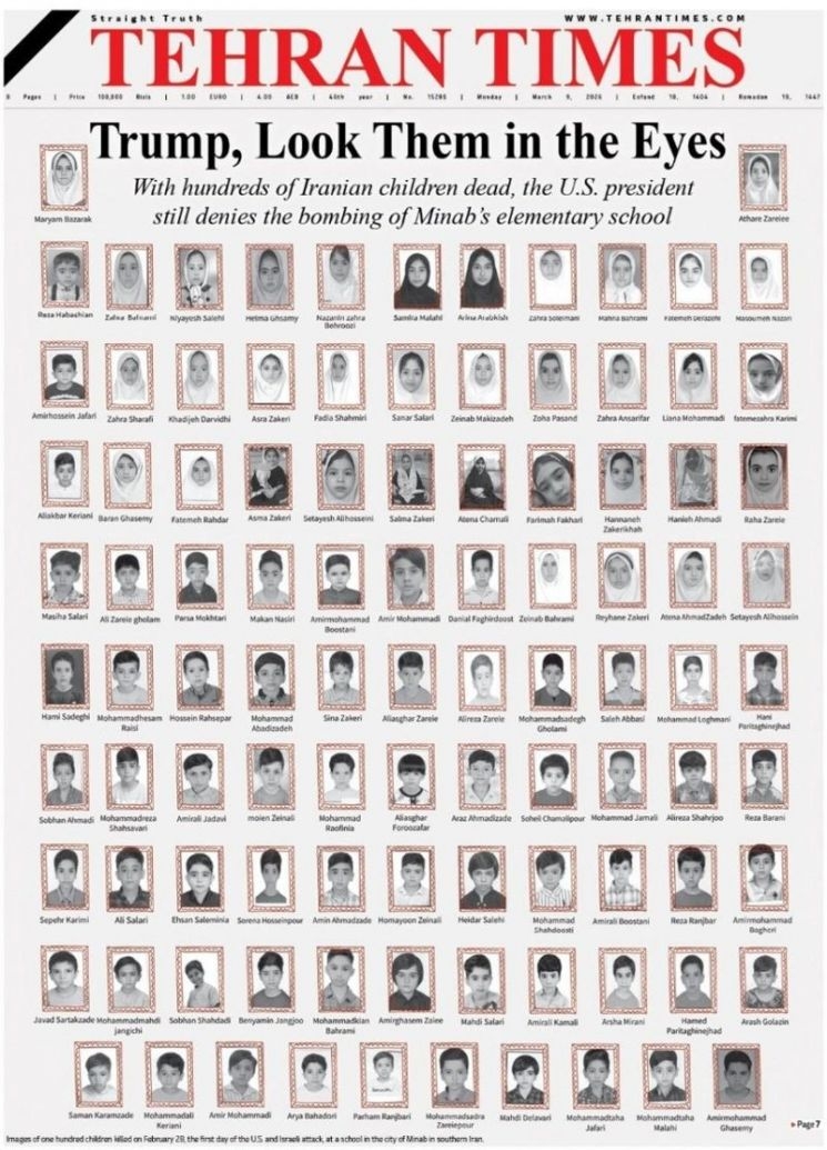| 미국과 이스라엘의 공습으로 사망한 것으로 알려진 이란 초등학생 100여명의 얼굴 사진이 이란 테헤란타임스 1면에 게재됐다. [엑스] |