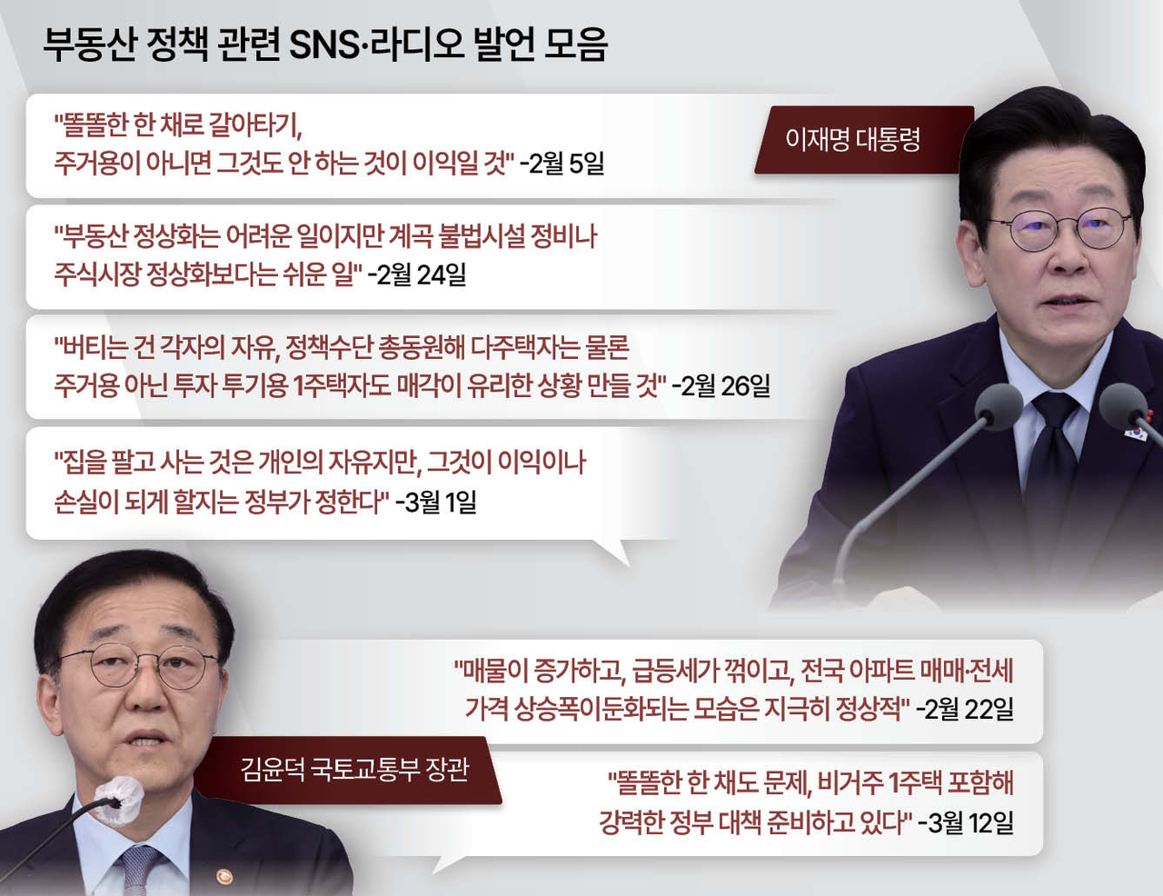 ▶李 “비거주 1주택도 투기”…과세표준 세분화되나=이날 김 장관은 ‘비거주 1주택’에 대한 장기보유특별공제(장특공제) 및 보유세 인상을 콕 짚어 시사했다. 이재명 대통령도 그간 거주하지 않는 주택은 ‘투기’로 간주하며 강력한 세제 혜택을 수차례 경고했다. 지난 2월 26일에는 X(엑스·구 트위터)를 통해 “버티는 건 각자의 자유지만, 정책수단을 총동원해 다주택자는 물론 주거용이 아닌 투자 투기용 1주택자도 매각이 유리한 상황을 만들 것”이라고 했다. 지난 1일에는 “집을 팔고 사는 것은 개인의 자유지만 그것이 이익이나 손실이 되게 할지는 정부가 정한다”고 했다.