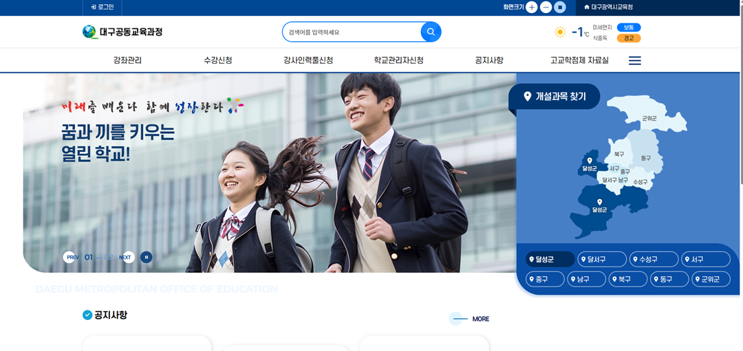 공동교육과정 선택과목 수강을 희망하는 학생은 12일 오후 6시부터 17일 오후 6시까지 대구공동교육과정에서 온라인으로 신청할 수 있다.