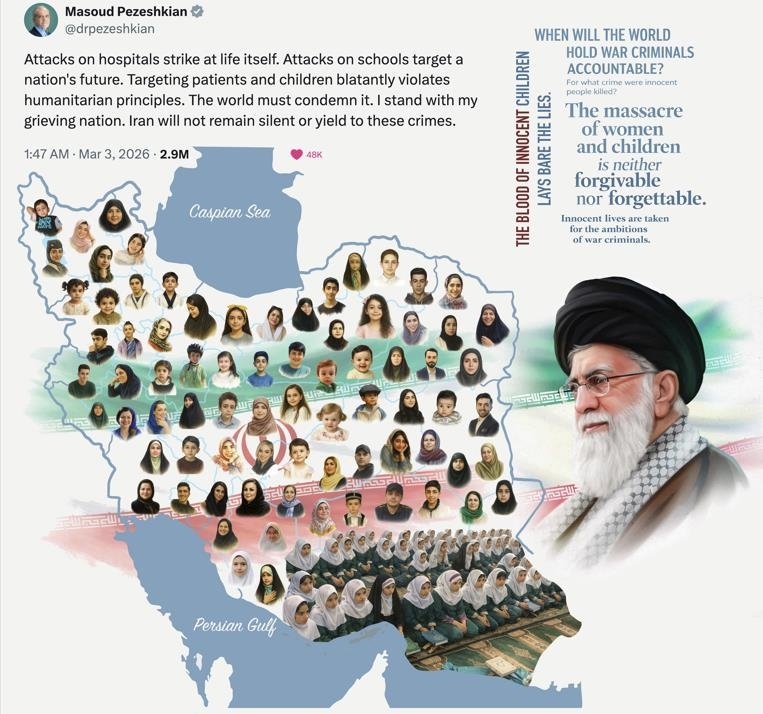 해당 현수막은 미국과 이스라엘을 전쟁범죄자로 규정하면서, 최소 175명이 숨진 이란 초등학교 공습의 책임을 물으려는 메시지로 풀이된다.