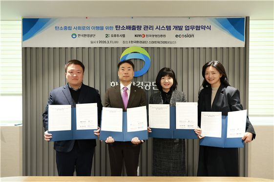 [헤럴드경제=이태형 기자] 기후에너지환경부 산하 한국환경공단은 11일 서울 당산동 한국환경공단 스마트워크센터에서 ‘탄소중립 사회로의 이행을 위한 탄소배출량 관리 시스템 개발’ 업무협약을 체결했다고 밝혔다.