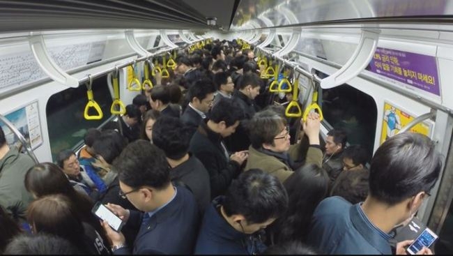 | 서울 시내 한 지하철 열차 안. 사람들로 혼잡하다(사진은 기사 내용과 관련없음). [연합] |