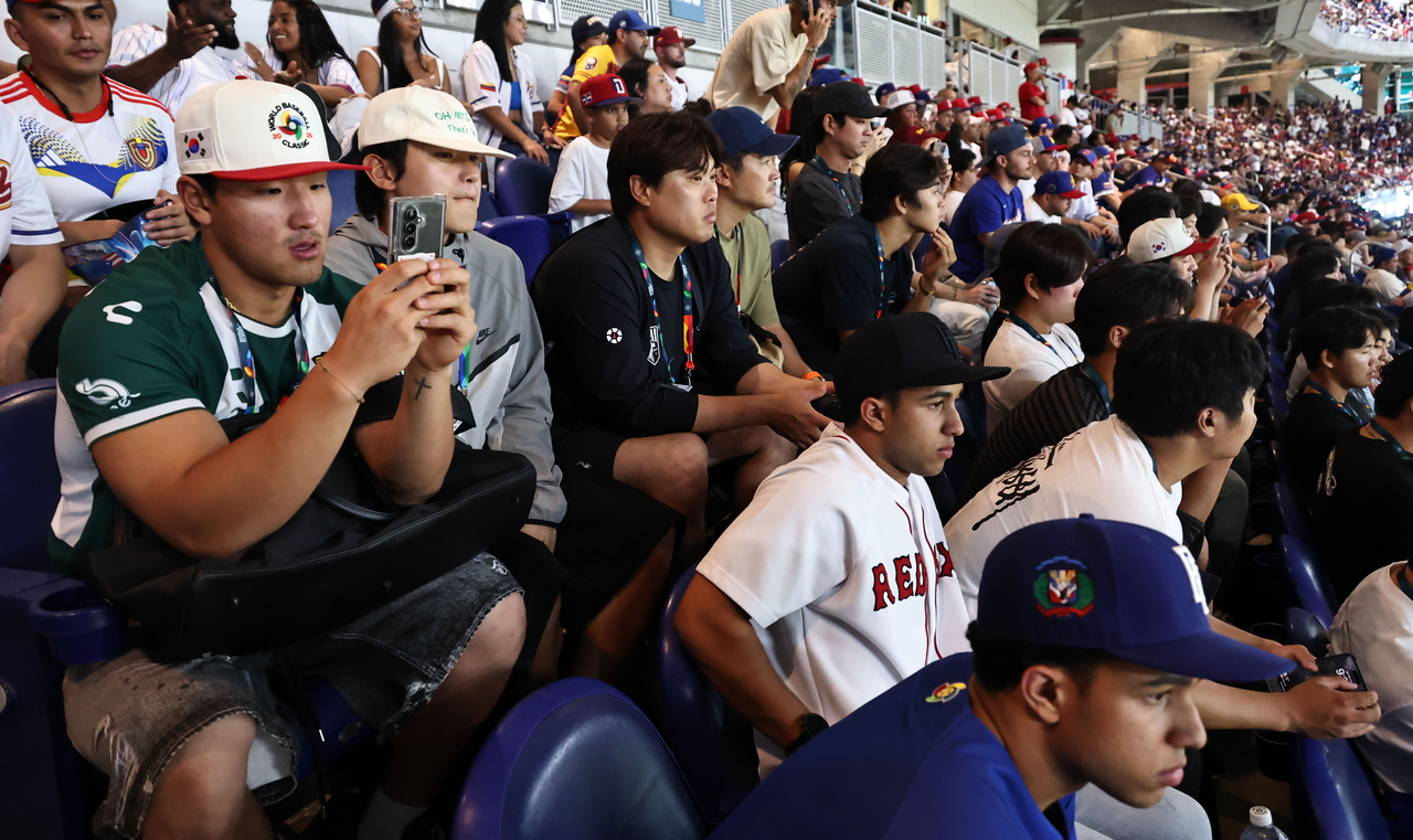 | WBC 한국 야구대표팀의 문보경과 류현진이 11일(현지시간) 미국 플로리다주 마이애미 론디포파크에서 열린 2026 월드베이스볼클래식(WBC) D조 도미니카와 베네수엘라의 경기를 지켜보고 있다. [연합] |