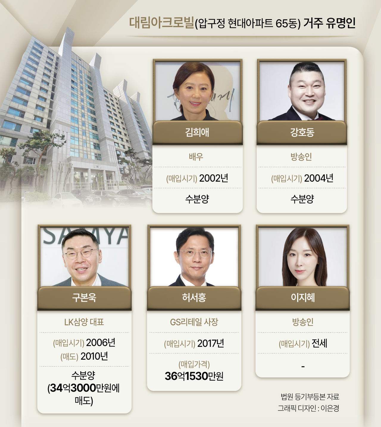 이처럼 ‘고급 아파트의 표준’으로 치밀하게 기획된 만큼, 대림 아크로빌을 선택한 거주자들의 면면도 화려하다. 사생활 보호와 쾌적한 주거 환경을 최우선으로 삼는 유명인들에게는 완벽한 은신처가 된 것이다.