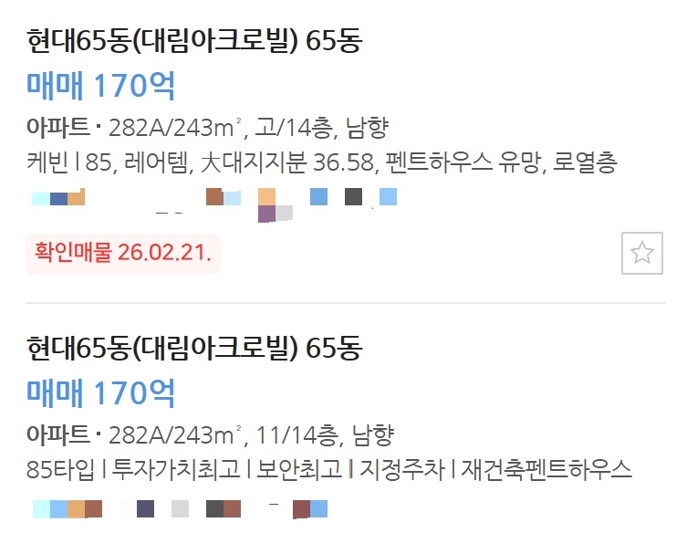 | 네이버 부동산에 등록되어있는 대림 아크로빌 매물 호가. [네이버 부동산 캡처] |