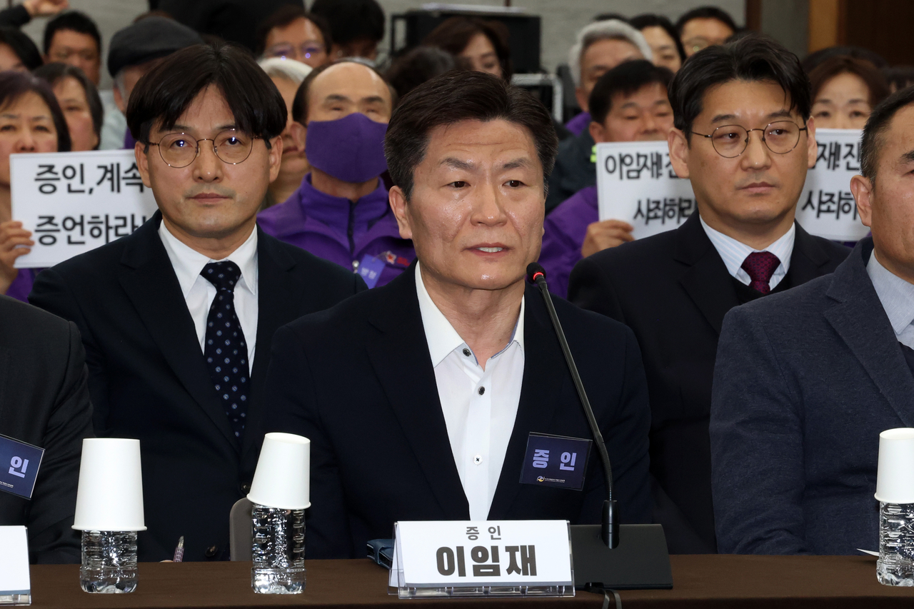 | 12일 서울 중구 은행회관에서 열린 10·29 이태원참사 진상규명과 재발방지를 위한 특별조사위원회 청문회에서 이임재 전 용산경찰서장이 경찰 배치 및 운용에 관한 심문 질의에 답하고 있다. [연합] |