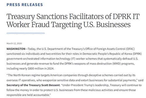 스콧 베선트 미 재무장관은 “북한 정권은 해외 IT 요원들이 수행하는 기만적인 수법을 통해 미국 기업을 표적으로 삼고 있다”면서 “트럼프 대통령의 지도 아래 재무부는 이런 악의적인 활동으로부터 미국 기업을 보호하고 책임자들을 처벌하기 위해 자금 추적을 계속할 것”이라고 강조했다.