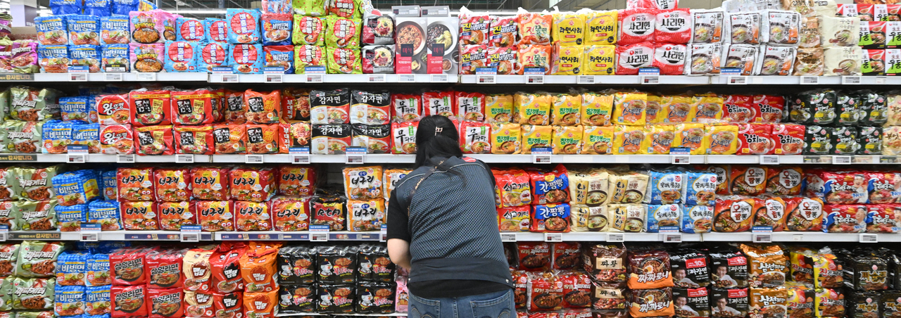 | 지난해 서울 서초구 하나로마트 양재점에서 직원이 라면을 진열하고 있다. 임세준 기자 |