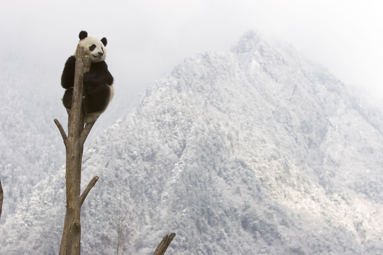 | 중국 쓰촨 지역에서 포착된 나무 줄기 위에 올라간 판다.[WWF 제공] |