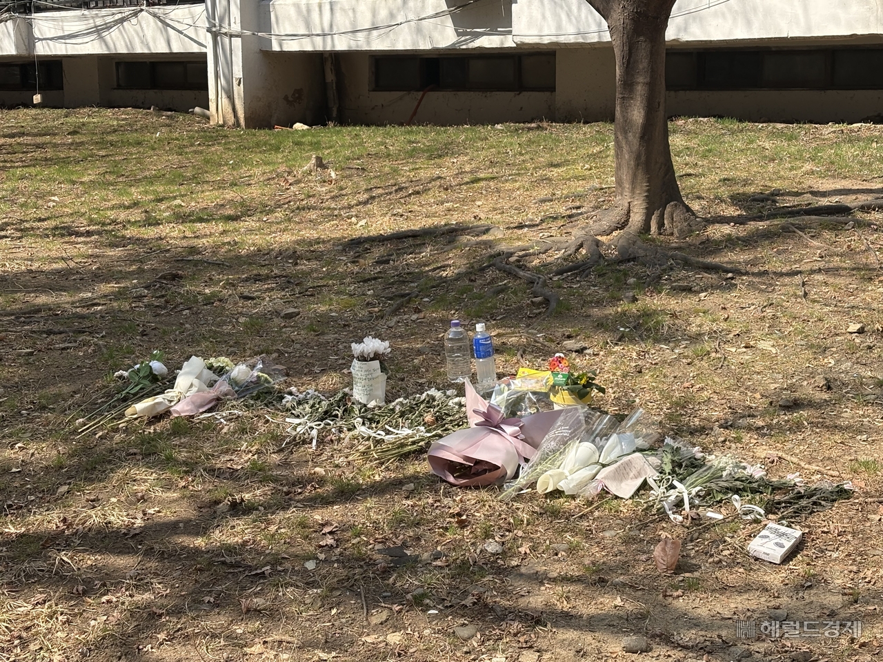 | 12일 화재가 발생한 동 앞에 마련된 추모 공간의 모습. 정주원 기자 |